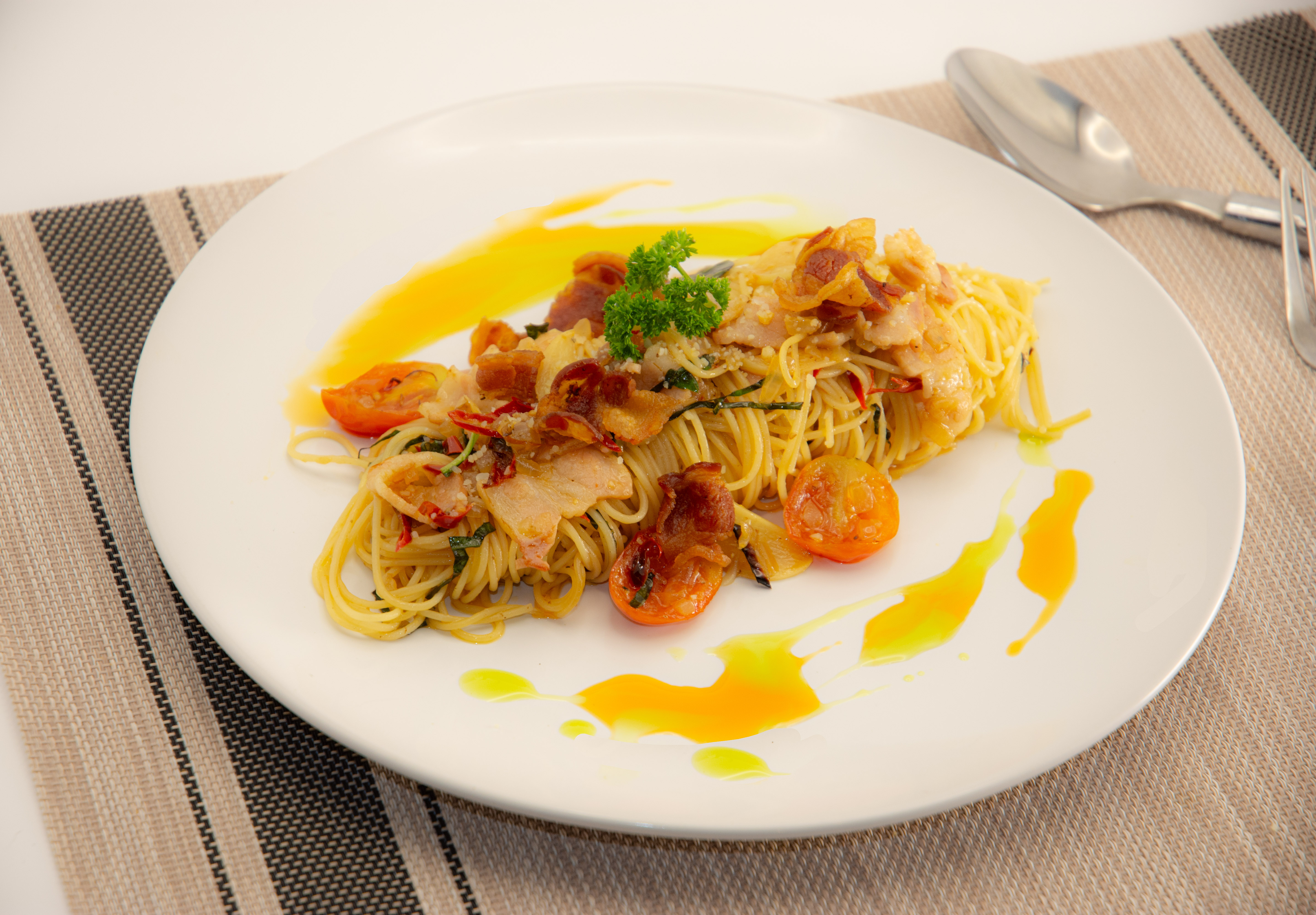 พาสต้าเส้นเล็ก ผัดกระเทียม พริกแห้งและเบคอน เสิร์ฟพร้อมเบคอนกรอบ น้ำมันใบโหระพา และ น้ำมันพริก