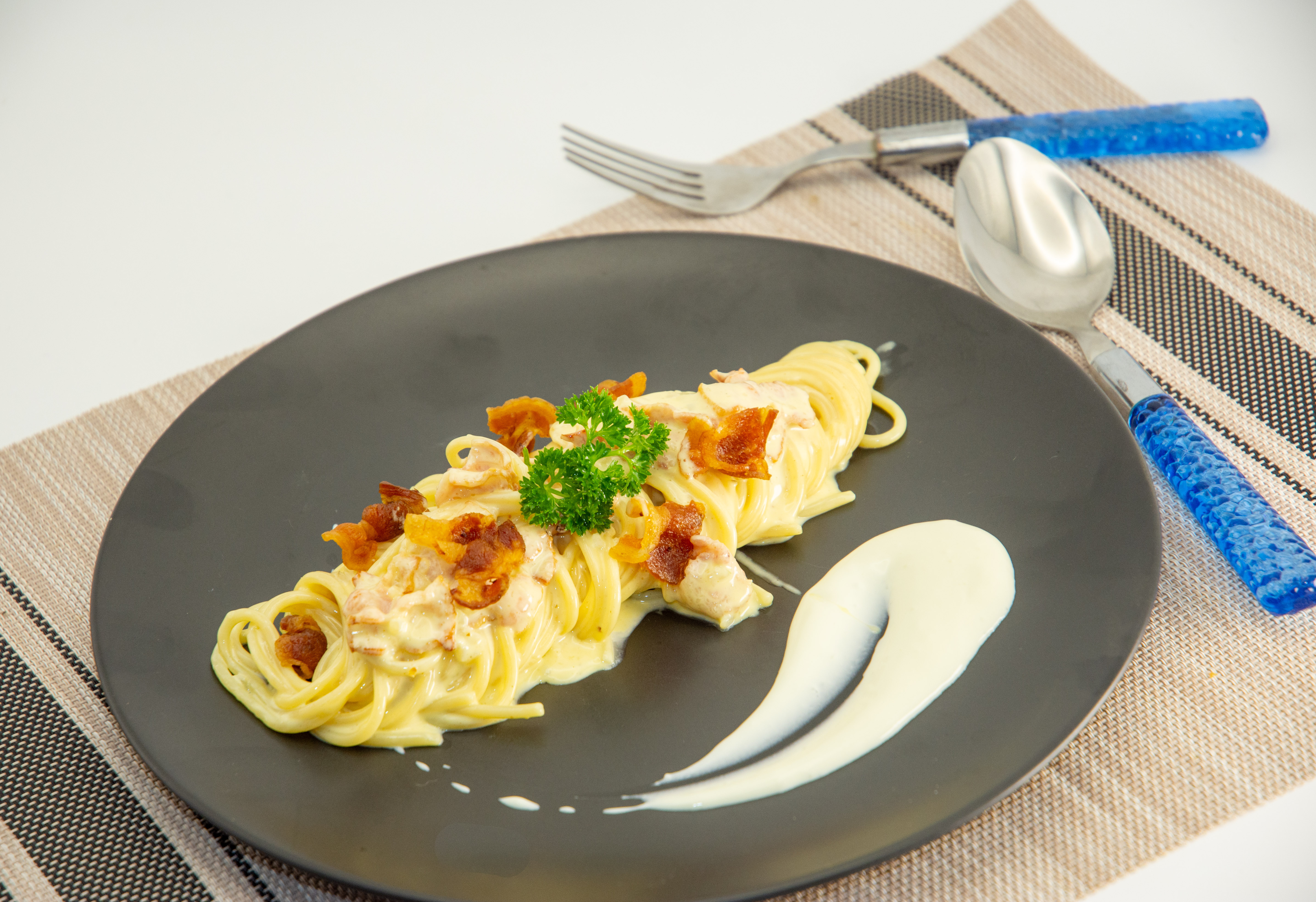 เส้นสปาเกตตี้ผัดกับเบคอน ครีมและพาเมซานชีส เสิร์ฟพร้อมกับเบคอนกรอบ **มีส่วนผสมของนม เนย ไข่**
