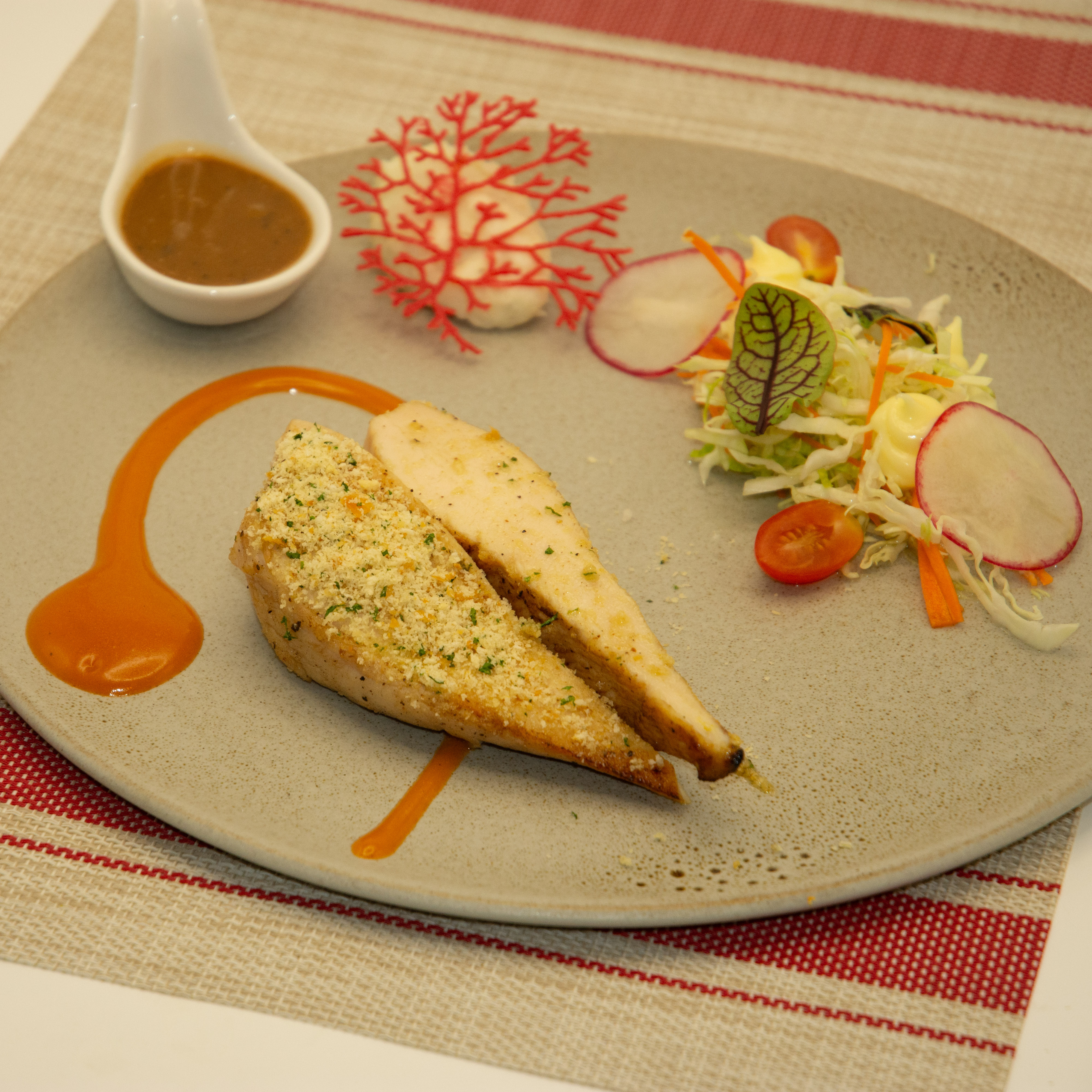 สเต๊กอกไก่ซูวี 5 ชั่วโมง โรยด้วยครัชสมุนไพร ทานคู่กับผักและซอสเกรวี่