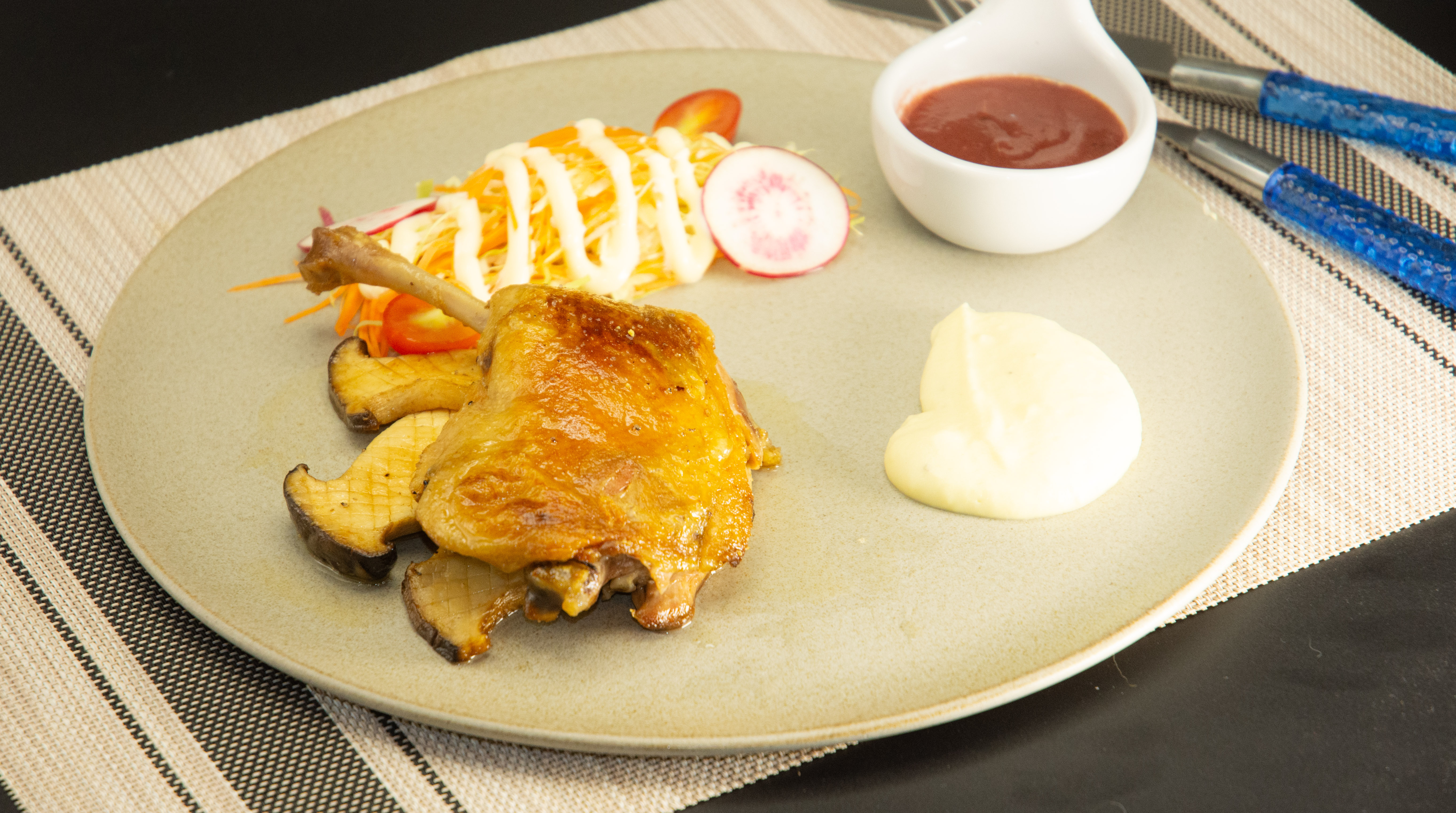 น่องเป็ดติดสะโพก ตุ๋นในน้ำมัน สไตล์ฝรั่งเศสนาน 8 ชั่วโมง ทานคู่กับมันฝรั่งยบด เห็ดย่าง ซอสเบอรี่และสลัดกระหล่ำปลี ** ซอสมีส่วนผสมของ ไข่ นม และเนย **