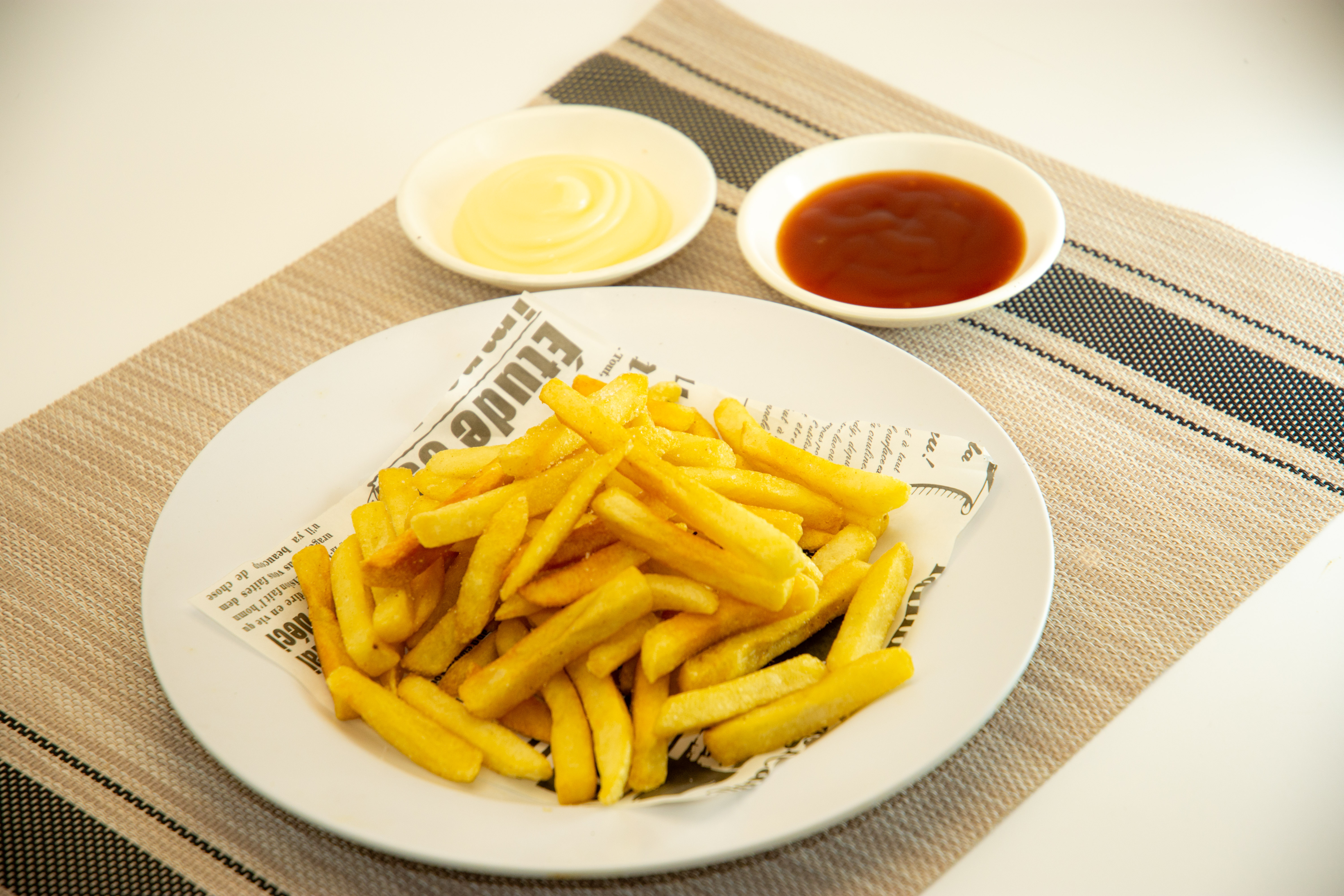 เฟรนฟรายทอด ทานคู่กับมายองเนสและซอสมะเขือเทศ