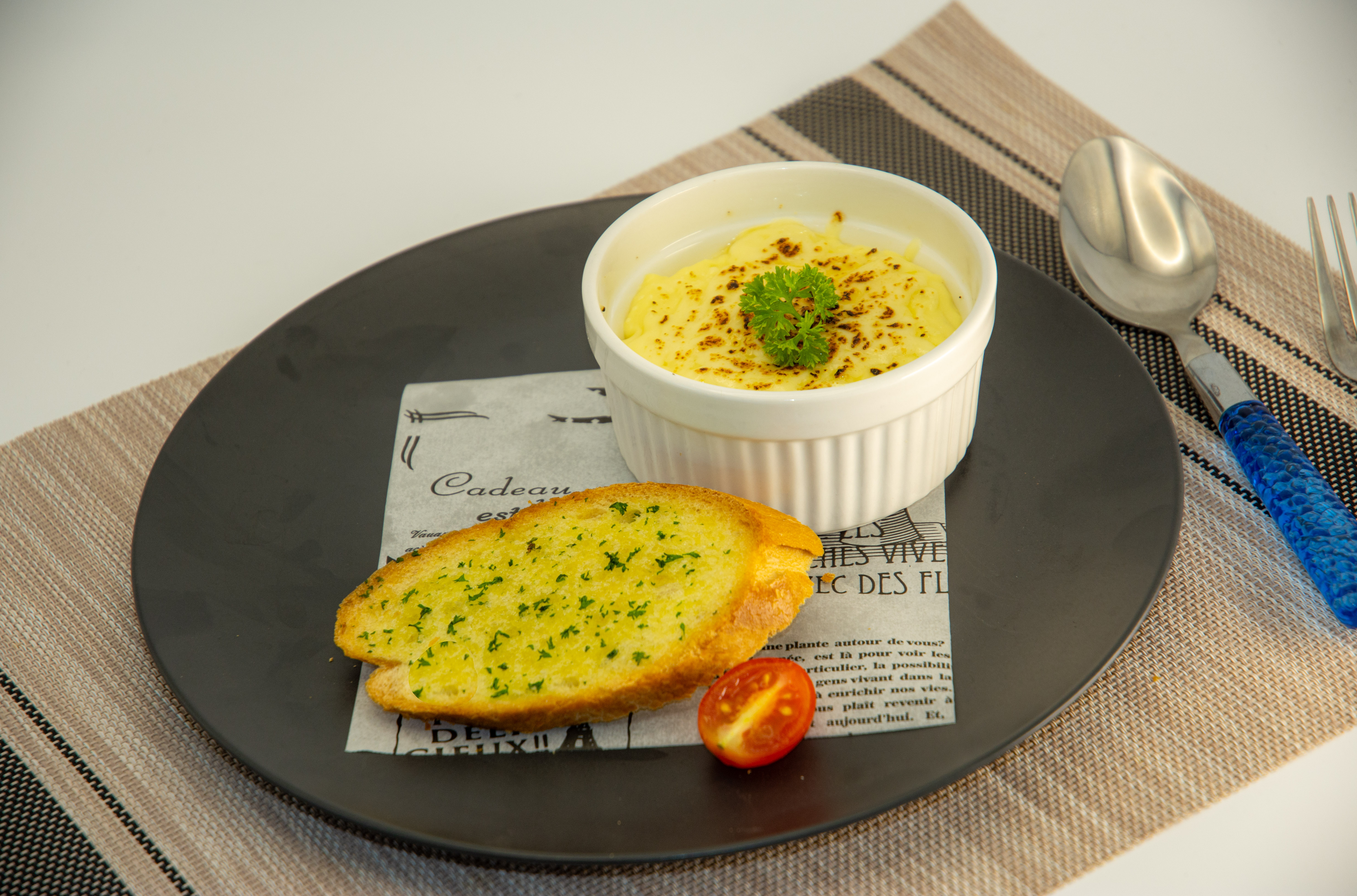 มันฝรั่งบด อบพร้อม มอสเซอเนลล่าชีส(ชีสยืด)และพลาเมซานชีส เสิร์ฟพร้อมขนมปังเนยกระเทียม **มีส่วนผสมของนมและเนย**