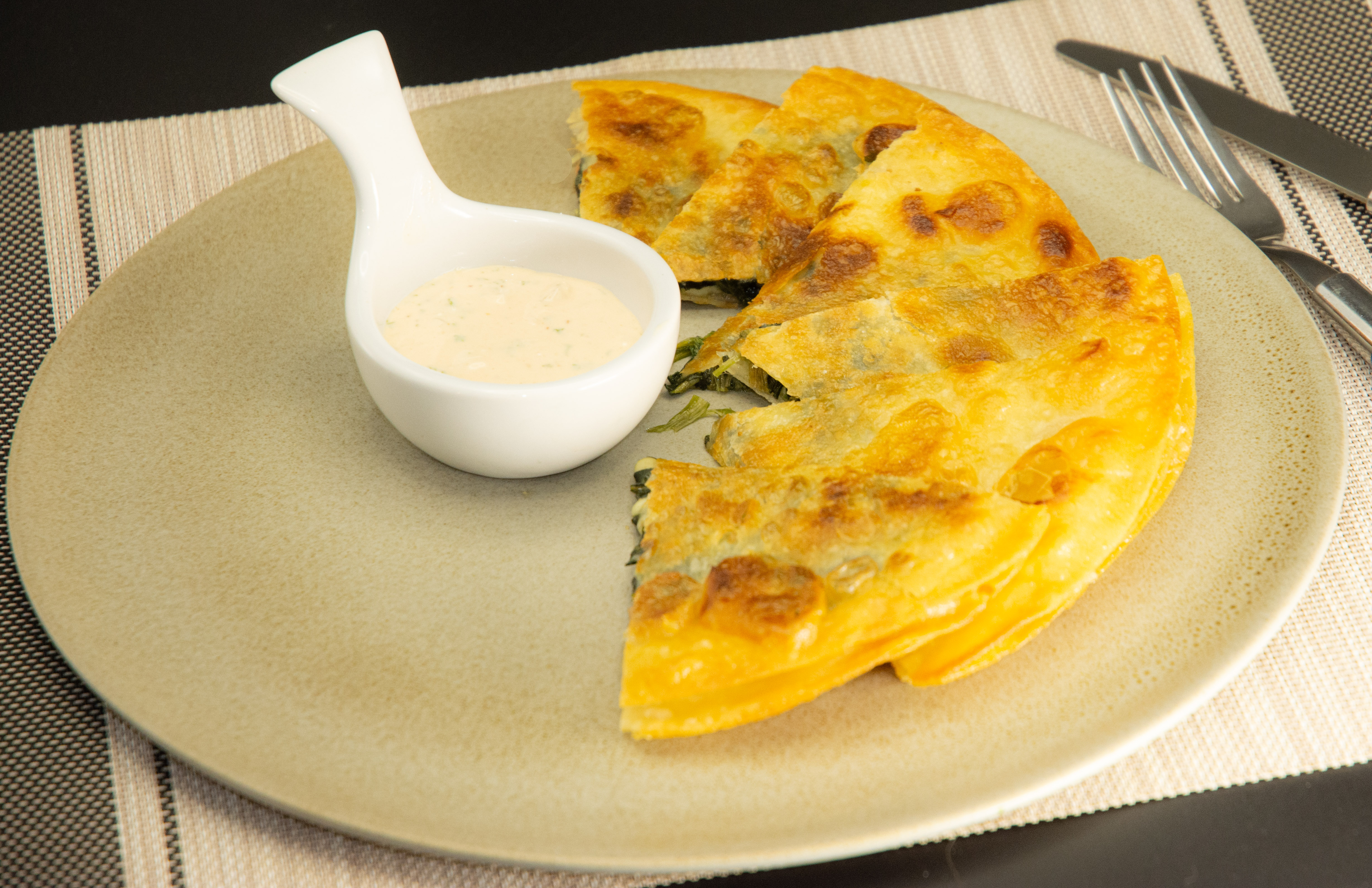 แป้งตอติญ่า ยัดไส้ด้วย ผักโขม เบคอน และมอสเซอเรลล่าชีส ทานคู่กับซอส เทาซันด์ไอแลนด์ **มีส่วนผสมของนมและเนย**