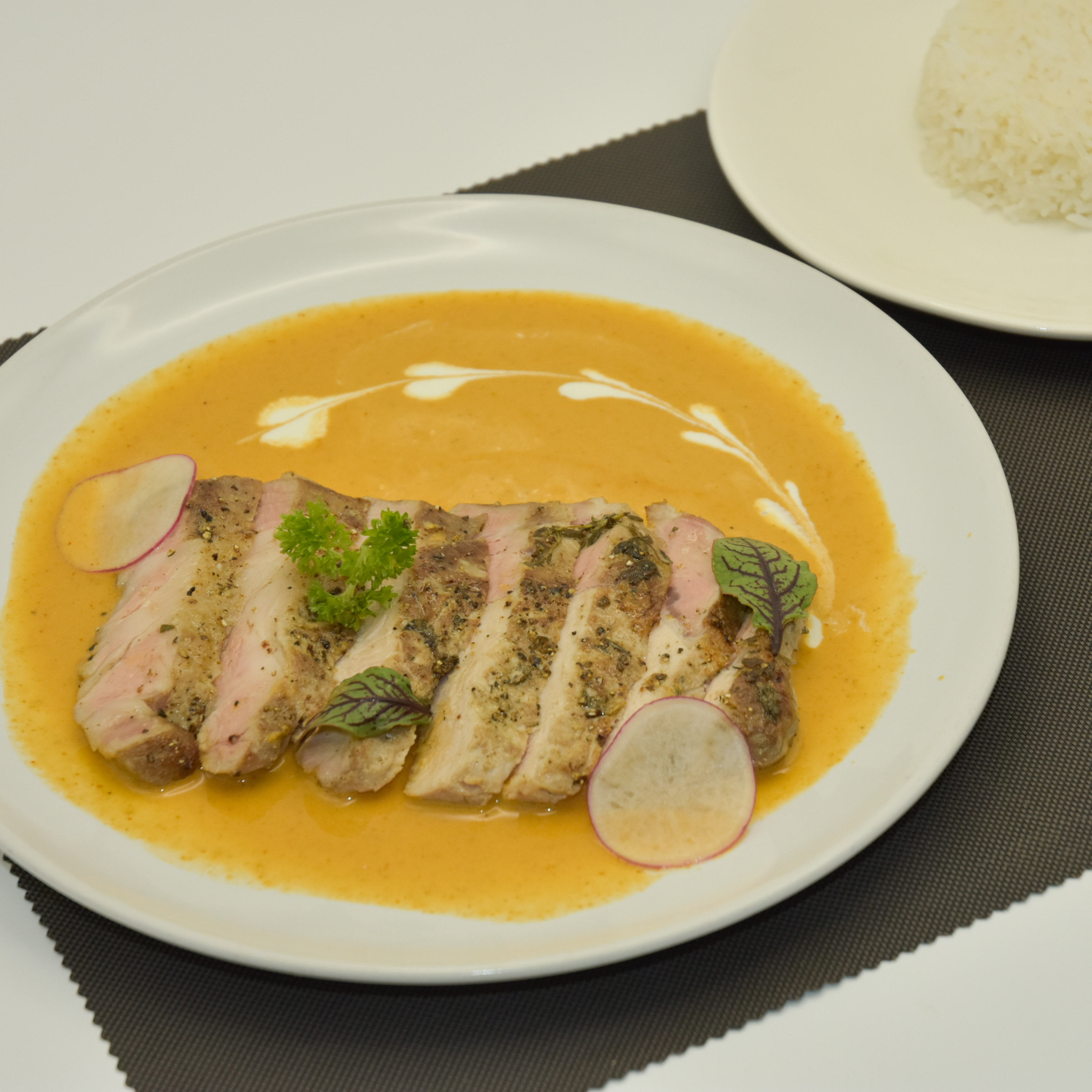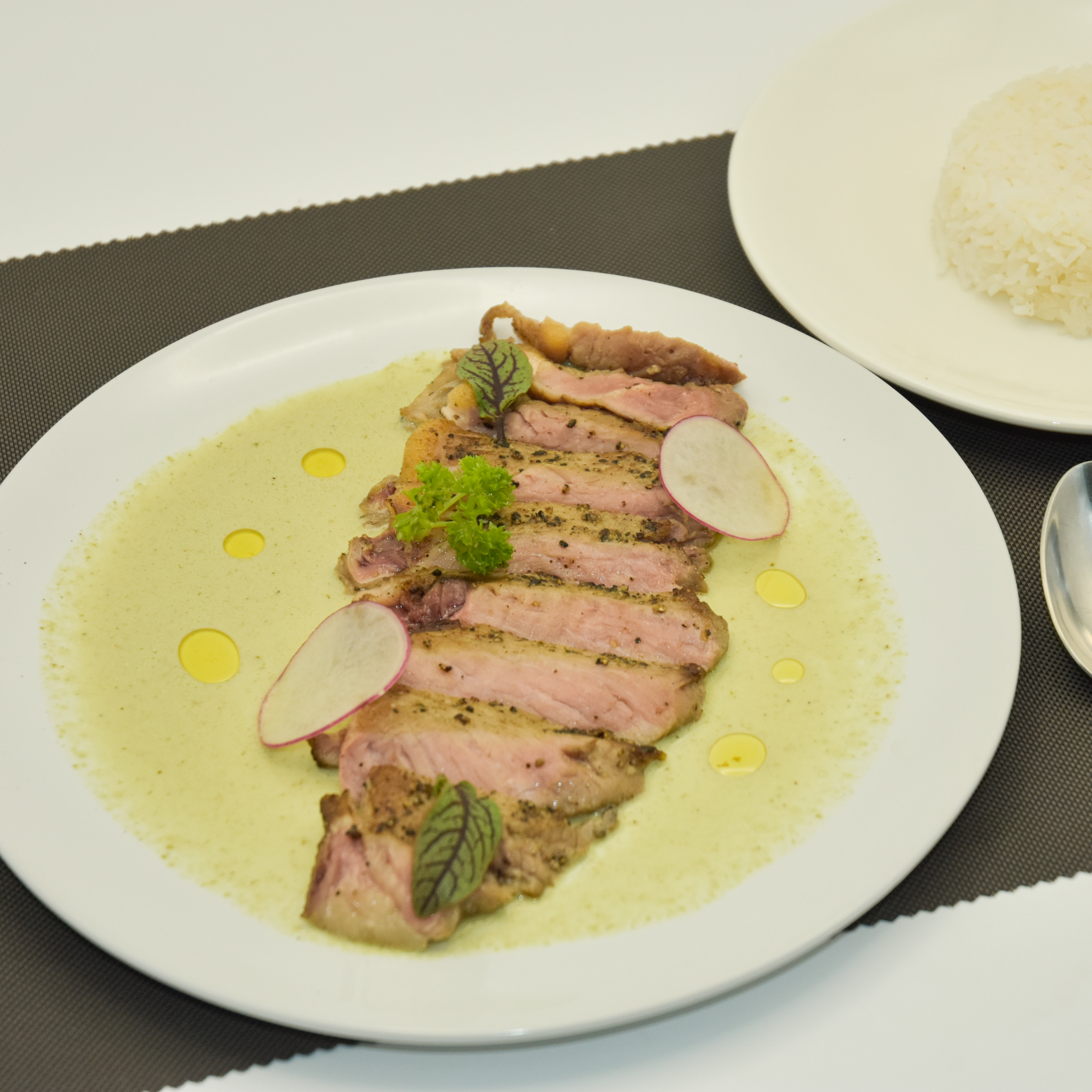 เนื้อสเต๊กหมูสันนอก ซูวี 6 ชั่วโมง และซอสแกงแพนงสไตล์ไทย ทานคู่กับข้าวหอมมะลิ