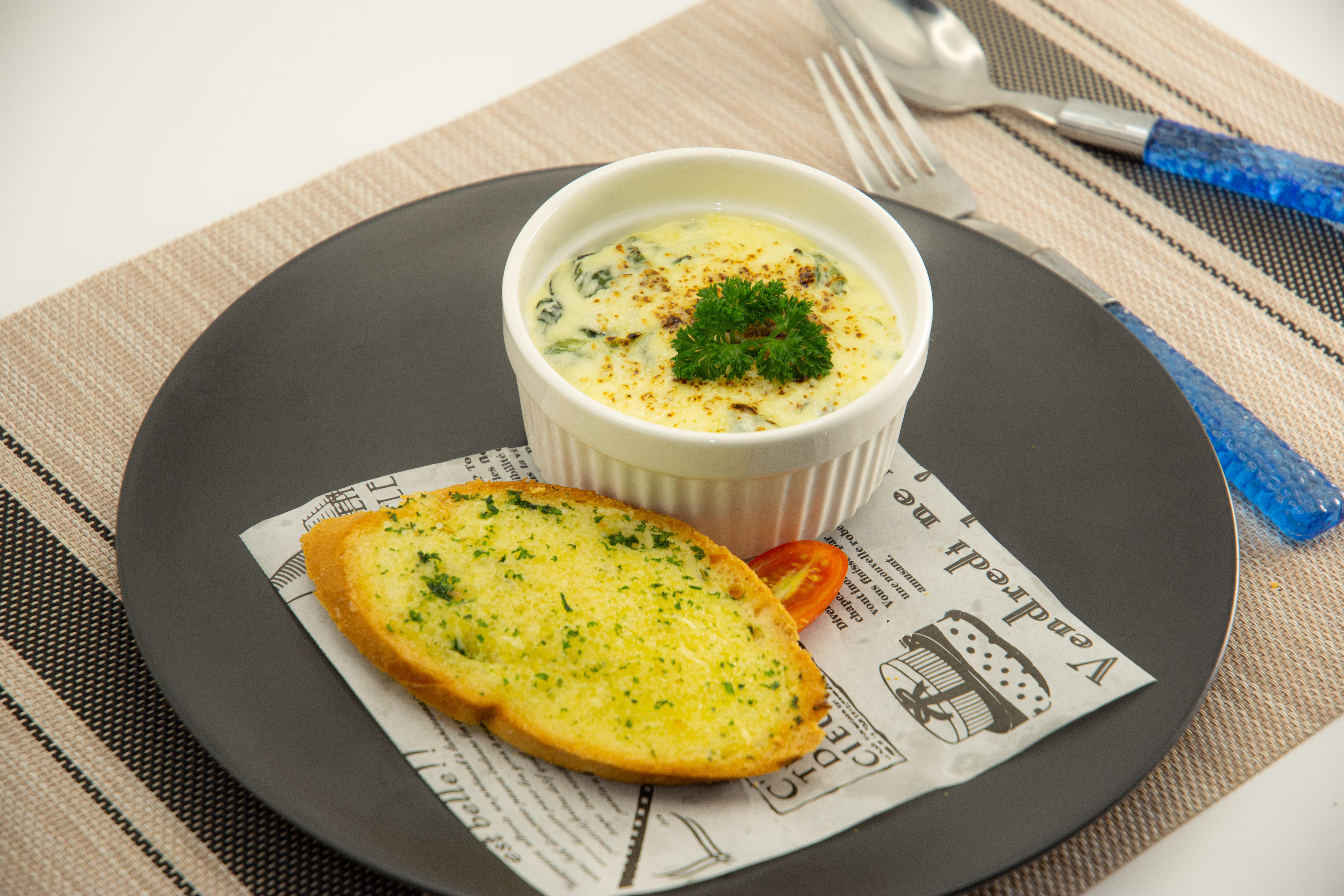 ผักโขมอบกับมอสเซอเรลล่าชีส(ชีสยืด)และพลาเมซานชีส เสิร์ฟพร้อมขนมปังเนยกระเทียม **มีส่วนผสมของนมและเนย**