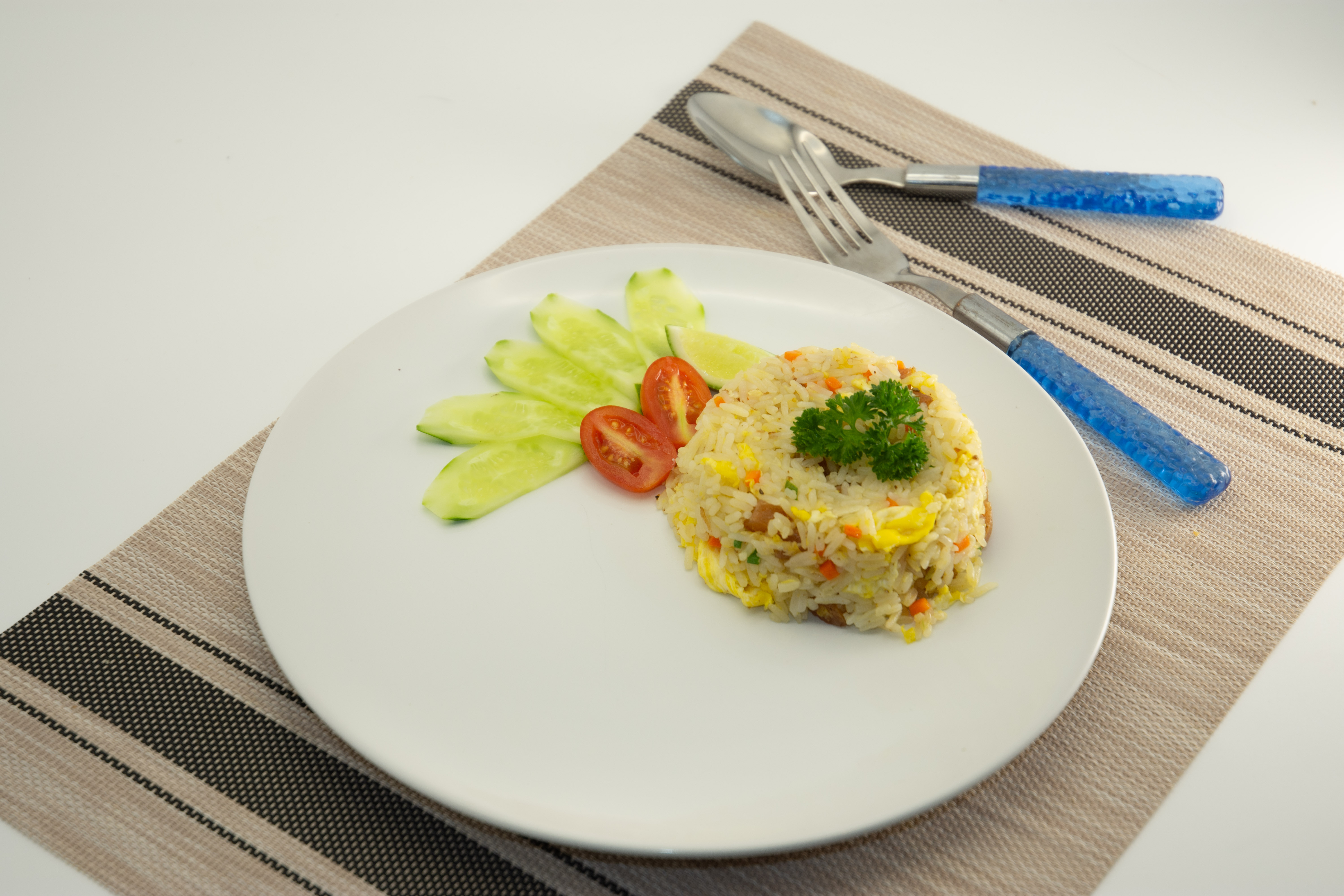 ข้าวผัดไข่ใส่กุนเชียง เครื่องเคียงเป็นแตงกวาและมะเขือเทศ