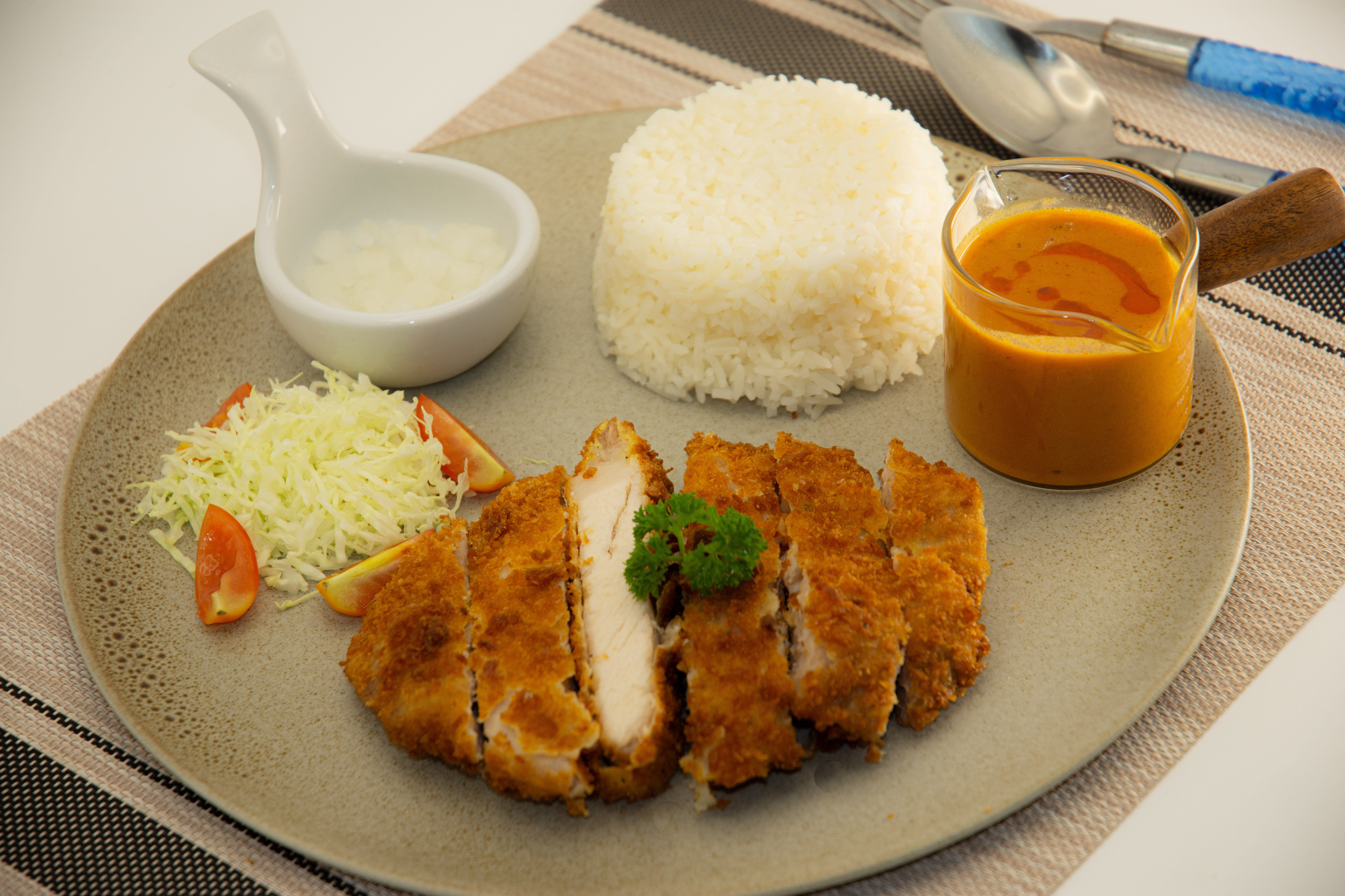 หมูสันนอกชุบแป้งทอดสไตล์ญี่ปุ่น ทานคู่กับซอสแกงมั่สมั่นเข้มข้นและข้าวหอมมะลิ พร้อมเครื่องเคียงเป็น หัวไชเท้าดองและกะหล่ำปลีฝอย